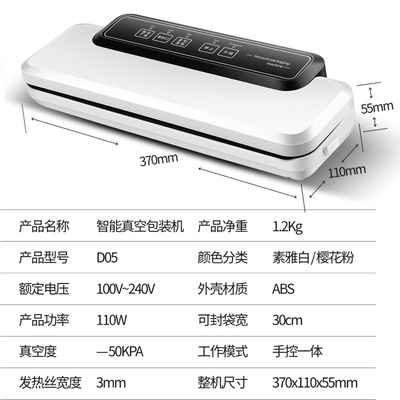货源类别订货号:4563|加工定制:是|货号:2655|类型:真空封口机|品牌:中性|型号:D05|功率:0.11(Kw)|重量:1.4(kg)|外形尺寸:375*145*60(mm)|包装材料:铝箔|包装类型:袋|生产能力:4/6(次/分)|自动化程度:手动|适用行业:食品,餐饮,烟酒,医药|售后服务:质保一年|电源:交流电|封口速度:4/6 次/分|封口宽度:30cm|薄膜厚度:单面9丝|耗用功率:110w|输送载重:0.5pa|温控范围:0-160度|印字个数:0|适用容器的最大尺寸:30*40cm|适用容器的最小尺寸:7*10cm|规格:白色|主要下游平台:ebay,亚马逊,wish,速卖通,独立站,LAZADA|主要销售地区:非洲,欧洲,南美,东南亚,北美,东北亚,中东|有可授权的自有品牌:否|是否跨境出口专供货源:是